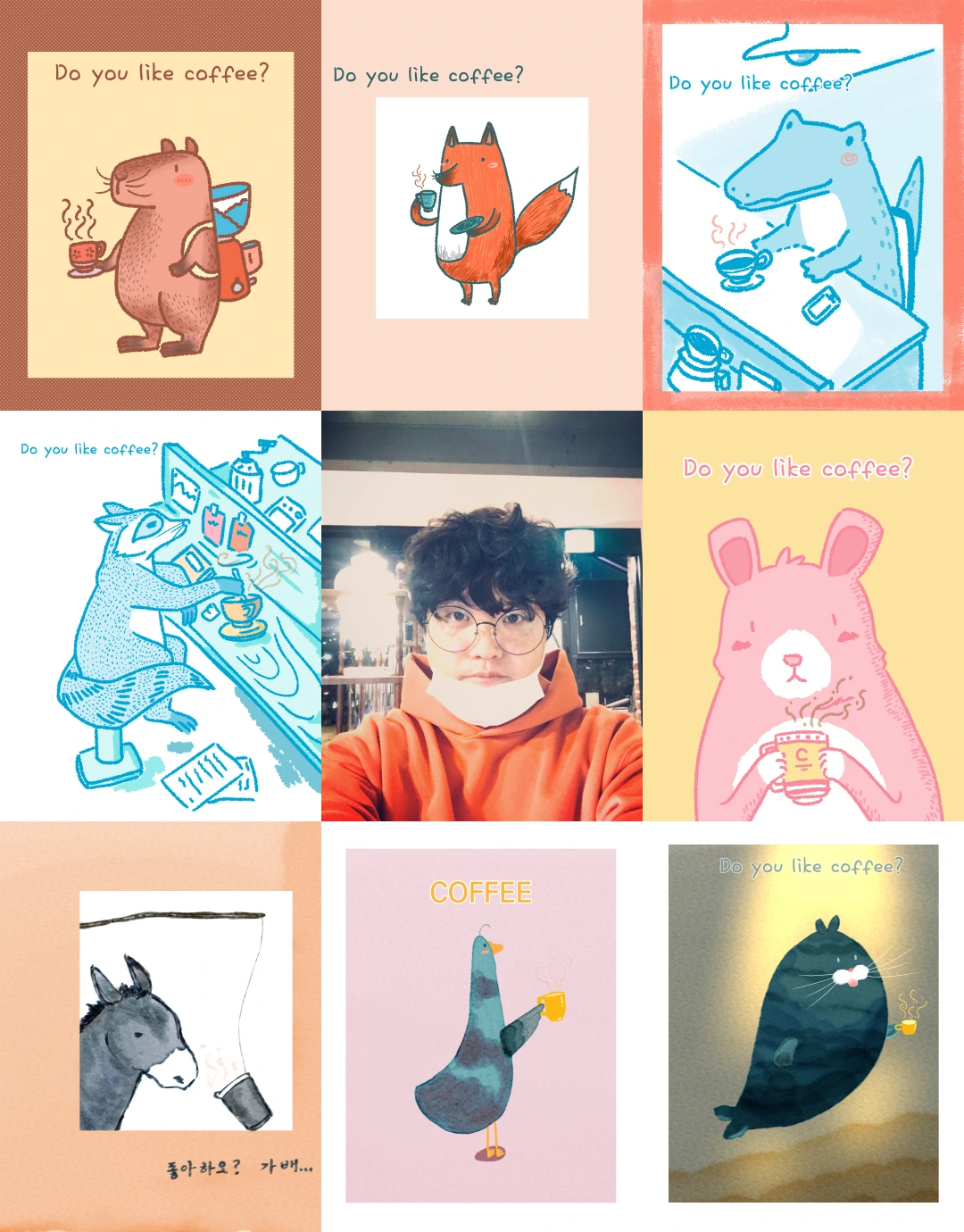 보통 동물 일러 그릴 땐 커피를 주제로 한 것이 많아 한번 꾸려봤습니다.