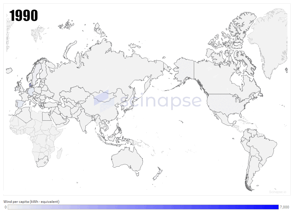 위의 지도는 1990년 부터 2021년 까지 국가별 인당 풍력 발전 전력 소비량을 나타낸다. 시간이 지날수록 풍력 발전으로 부터 생성된 전력 소비가 점점 증가하는 추세이다. 풍력 발전은 유럽의 덴마크에서 가장 먼저 빠른 속도로 증가하였다. 이후 서유럽, 북유럽이 따라 증가하였다.