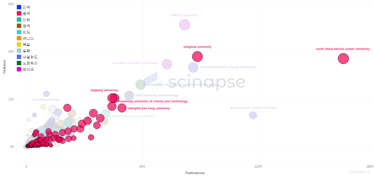 아래의 이미지는 2021년 풍력 발전을 연구한 기관의 연구 성과를 나타낸 그래프이다. X축은 기관이 출판한 논문수를 의미하며, Y축은 해당 기관들의 피인용수를 의미한다. 각 점의 색은 해당 기관의 소속 국가를 나타내며, 원의 크기는 기관이 출판한 풍력 발전 논문으로 산출한 h-index 이다. h-index는 미국의 물리학자 호르헤 E. 허쉬(Jorge E. Hirsch)가 개발한 지표로 저자의 논문 생산성과 인용 영향력을 동시에 보여주는 지표이다.