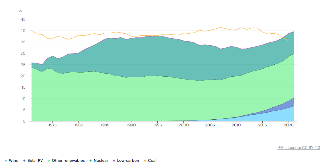 또한, 실제 재생 가능 에너지의 전력 생산 또한 꾸준히 증가하고 있다. IEA의 2021년 데이터에 따르면, 총 전력 생산에서 석탄 연료의 비중은 점점 감소하는 반면 재생 가능 에너지의 비중은 증가하고 있다. 특히, 2000년 태양 에너지와 풍력발전은 각각 0% 와 0.2%에서 꾸준히 증가하여 3.4%와 6.7%로 증가하였다.