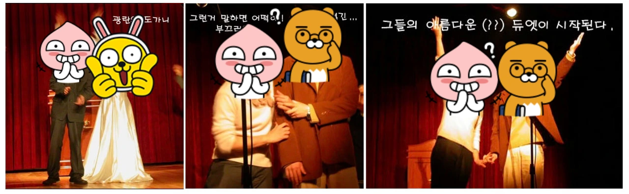 한 달이 넘게 진행된 뮤지컬 수업은 아직도 좋은 추억으로 남아있다. 직접 뮤지컬 각본을 짜고 노래를 선정하고, 안무를 맞추고 직접 공연까지 해보는 경험을 또 어디서 해볼까? 운 좋게도 팀 내부 오디션을 거쳐 나름 주연으로 캐스팅되어 한 달 내내 노래 부르고 춤추며 밤을 새웠던 기억이 난다. 싸이월드에 접속해서 그때 사진을 다시 보니 정말 오글거리지만 일부를 공개해 본다. 당시 우리 팀이 연출한 뮤지컬 주제는 '세상에는 다양한 사랑이 있다'이다. 대충 복장을 보면 내가 무슨 사랑을 대변했는지 알 수 있을 것이다. (세 사진의 왼쪽이 모두 나다)
