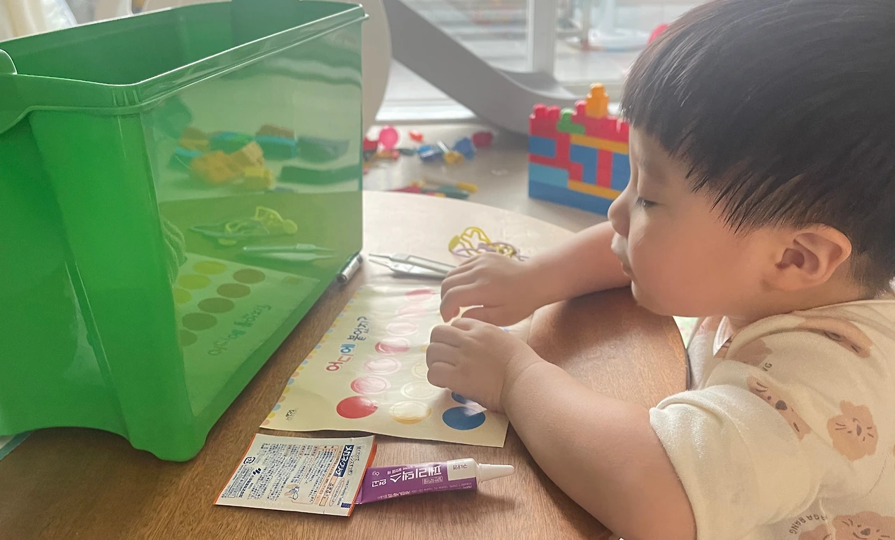 그러던 어느 날. 컴퓨터 뚝딱뚝딱하고 있다고 아빠를 부른다. 가봤더니 아래 사진과 같이 자신만의 컴퓨터를 만들어 놀고 있다. 블록 담는 통은 모니터, 동그란 스티커 종이는 키보드란다. 그러면서 타이핑하는 모습을 흉내 내며 좋아하는 녀석. 본능적으로 컴퓨터에 아직 모르는 재미난 것이 있다는 것을 눈치챈 것만 같다.