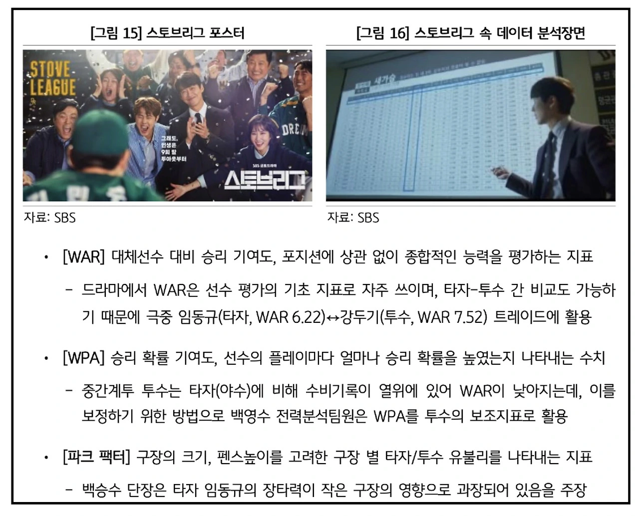 이제 운동신경이 없어 직접 야구를 즐기지 못한 사람들도 야구 산업에 뛰어들 수 있는 길이 있다. 바로 야구를 '데이터'로 분석하는 것이다. 우리는 이를 세이버매트릭스(Saber-metrics)라 부른다. 세이버메트릭스는 야구를 객관적으로 분석하기 위한 연구 방법으로 야구 데이터에 대한 수학적, 통계적 분석을 통칭한다. 최근에는 머신러닝, 딥러닝 등 인공지능 기술들까지 결합되고 있다. 불과 얼마 전까지 세이버매트릭스는 야구 마니아들의 전유물이었지만 브래드 피트 주연의 영화 <머니볼>과 남궁민 주연의 드라마 <스토브리그>로 대중들에게도 친숙한 개념이 되었다.