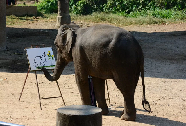 고도의 훈련을 받은 코끼리는 관광객 앞에서 그림을 그린다. 코끼리 이름을 그림에 새겨 넣기도 한다. 낙관 쾅! 아프리카와 동남아에서 코끼리를 이용한 관광 상품은 상당히 많다. 대부분은 코끼리를 타는 체험이지만, 간혹 위와 같이 코끼리를 이용한 기이한 일들도 벌어진다. 물론 이러한 행위들은 동물보호단체로부터 동물 학대라는 비난을 받고 있다. 그림 그리는 행위 역시 코로 붓을 잡게 하는 과정에서 학대 행위가 많다는 비난이 상당하다.