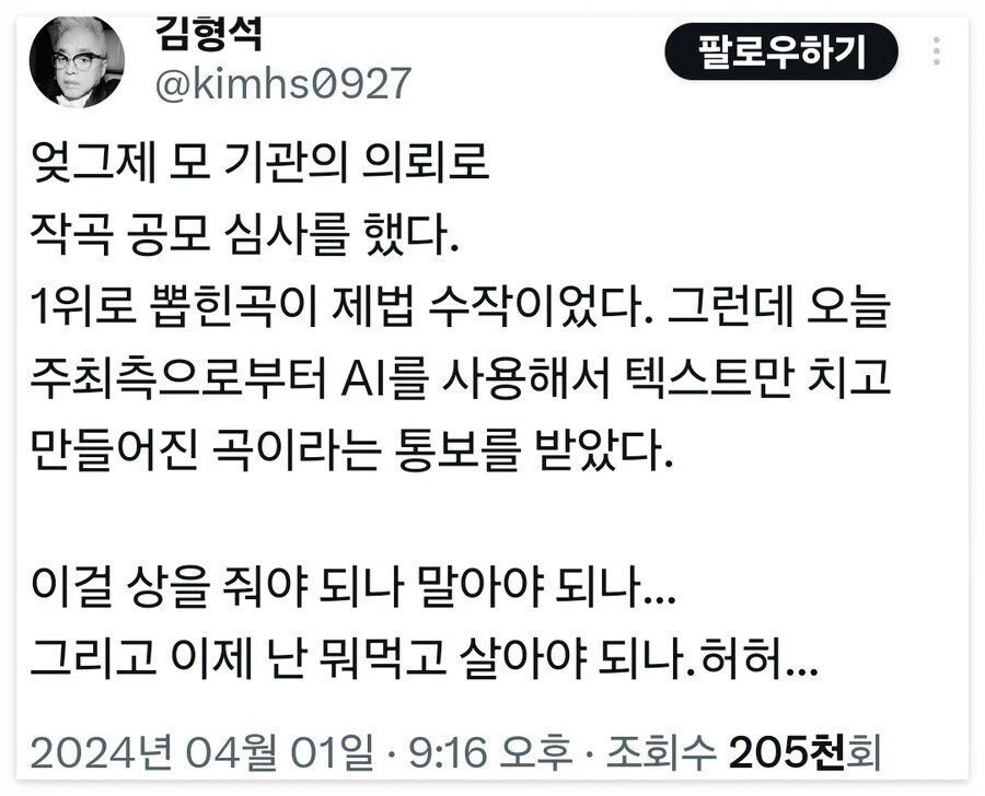 연일 생성형 인공지능이 만들어내는 작품들로 시끄럽다. 앞선 글에서 소개한 오픈AI의 동영상 생성 인공지능, 소라(SORA)를 전문가들이 활용하여 만든 영상은 놀라운 영상미와 작품성으로 대중들에게 놀라움을 선사했다. 해당 글은 아래 링크에서 확인 가능하다. 며칠 전 작곡가 김형석이 올린 트윗도 화제다. 본인이 심사위원으로 참여한 작곡 경진대회에서 1위 한 작품이 인공지능으로 만들어진 곡이었다는 것. 심지어 텍스트만 입력받은 인공지능이 온전히 작곡한 곡이다.