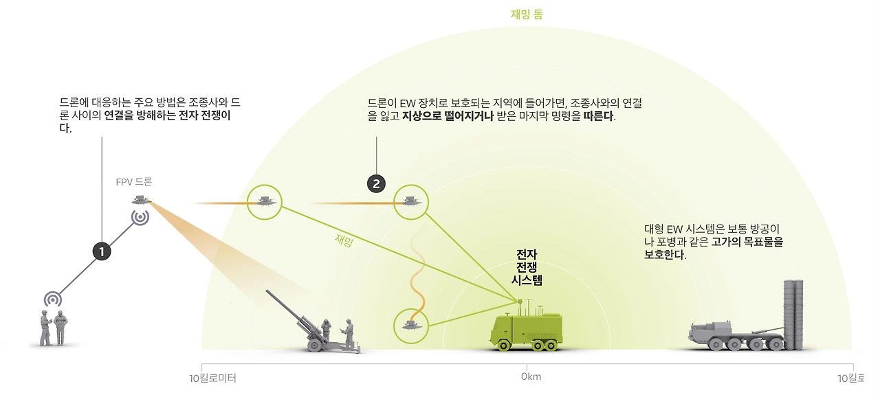항상 창이 나오면 방패가 등장한다. 드론을 막기 위해 러시아는 대량의 전자전(Electronic Warfare) 시스템을 최전선에 배치하고 있다. 전자전 시스템은 드론의 무선통신 주파수를 방해하여, 드론이 스스로 떨어지도록 만든다. 이들 장비는 각각 특정 주파수를 방해하고 있고, 우크라이나는 이들이 방해하는 주파수가 아닌 주파수를 통해 드론을 조종하려고 한다. 전쟁의 최전선에서 무선 주파수를 놓고 고양이와 쥐 게임이 이어지고 있는 것이다.