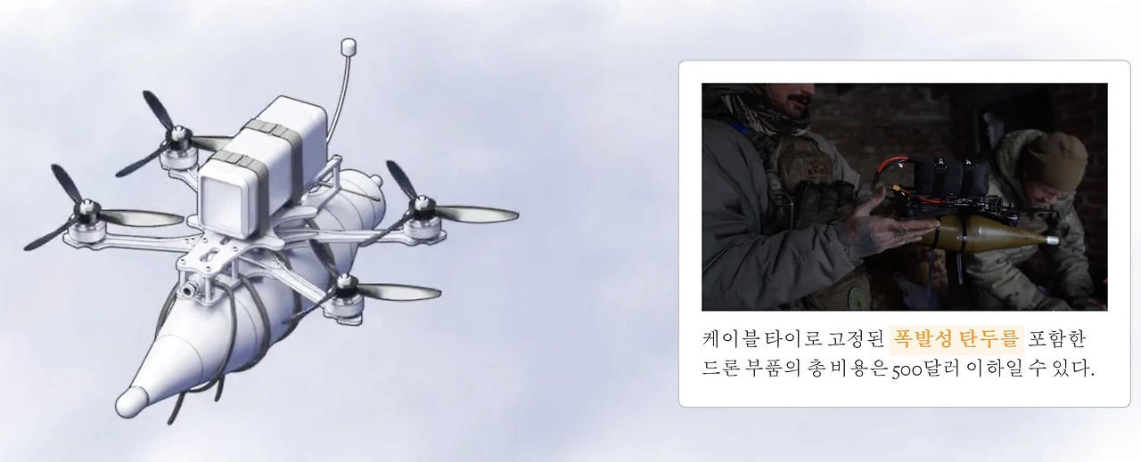 드론은 작으면서 저렴하다. 뉴스를 얼핏 보면 드론이 탱크도 잡고, 시설물도 폭파시키기 때문에 고가의 장비라 오해하기 쉽다. 하지만 우크라이나 군이 사용하는 드론의 본체는 저렴한 중국산 드론이며, 거기에 케이블타이로 폭발성 탄두를 고정시킨다. 저렴하면서 쉽게 구할 수 있는 드론이기에 상대적으로 열세에 놓였던 우크라이나군이 드론을 적극 활용한다. 이슬람 무장 집단이 싸게 구해서 적극적으로 활용한 대전차포였던 '알라의 요술봉', RPG-7과 그 궤를 같이 한다.