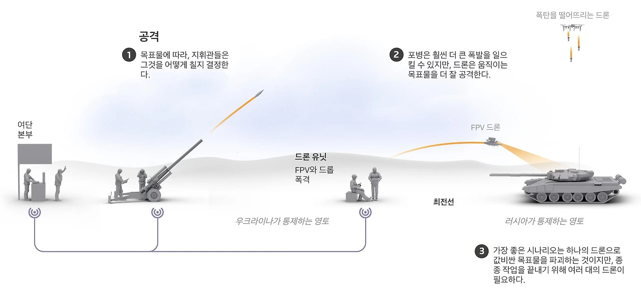 전장에서 활용되는 드론은 단거리 드론과 장거리 드론으로 구분된다. 단거리 드론을 활용하는 부대는 최근 조직화되어 전장에 투입되고 있다. 이들 부대에서는 드론을 직접 조종하는 임무를 병사들에게 부여한다. 임무를 받은 병사들은 드론이 촬영하는 영상을 실시간으로 전달받고, 목표물을 태블릿을 통해 '병사'들이 직접 설정한다. 그러면 드론은 이 명령을 따라 목표물을 타격한다. 우크라이나에 따르면 드론을 피하기 위해 러시아의 탱크와 중장비는 최전선에서 몇 킬로미터 뒤에 위치해야만 했다. 보병들 역시 드론을 가장 큰 위협으로 언급하며, 참호를 오가다 공격받는 경우가 많다고 말한다.