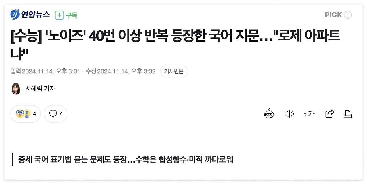 이처럼 인공지능을 다루는 사람에게는 익숙한 디퓨전 모델이지만, 학생들에게는 생소했나 봅니다. 예년대비 쉬운 것으로 평가받는 올해 수능 국어영역이지만, '노이즈'가 자주 언급된 인공지능 문제가 나름의 킬러 문제였다는 기사가 나오네요.