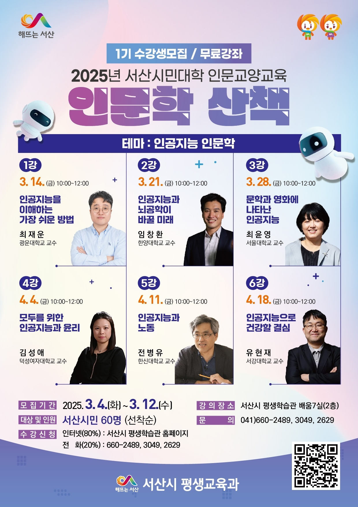 책을 낸 후, 여러 차례 강연의 기회가 생기고 있다. 3월에는 서산에서 강연을 진행했다. 아래 포스터에 나온 '인문학 산책' 강좌였다. 그것도 내가 1 빠따였다. 첫 스타트를 잘 끊어야 한다는 부담감에 서산으로 향했는데, 100명의 청중을 보니 더욱 긴장되었다.