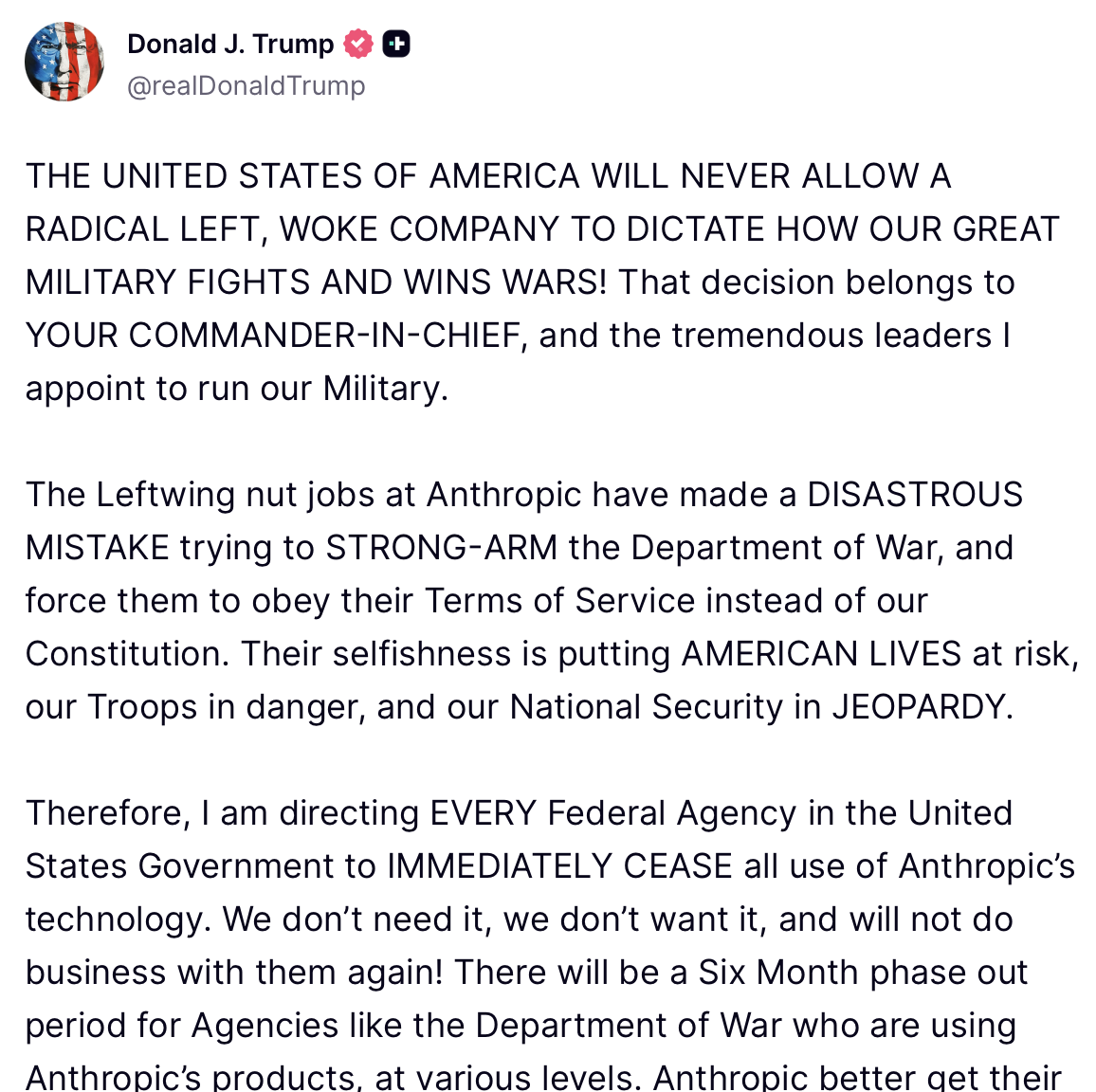클로드가 이란 작전에 투입되기 불과 몇 시간 전, 도널드 트럼프 대통령은 트루스소셜에 이렇게 썼다. "나는 미합중국의 모든 연방기관에 앤트로픽의 기술 사용을 즉각 중단할 것을 지시한다." 국방장관 피트 헤그세스는 앤트로픽을 '공급망 위험(supply-chain risk)'으로 지정했다. 이는 통상 화웨이 같은 적국 기업에나 붙이는 딱지다. 미국의 AI 기업이 자국 정부로부터 이런 낙인이 찍힌 것은 전례가 없는 일이었다.