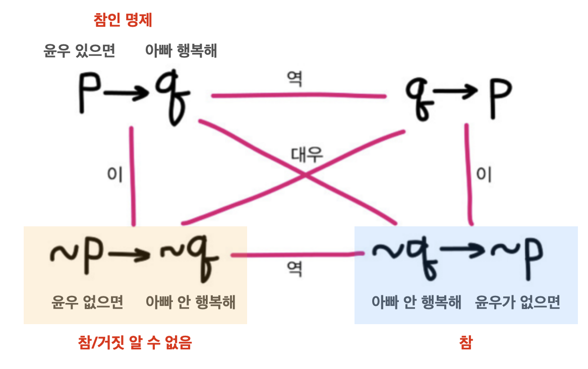 고등학교 수학 시간에 명제에 대해서 배운다. 그때 등장하는 내용이 명제의 참과 거짓을 찾기 위한 방법들. 본 명제가 참일 경우 대우 명제가 참이라는 것을 고등학교 때 암기식으로 배운 바 있다. 아래 그림을 살펴보자. 아빠가 말한 명제는 '윤우가 있으면 (p), 아빠는 행복해 (q)'로, 참인 명제이다. 우리 아들이 고민을 거쳐 얘기한 문장은 p와 q를 모두 부정하였지만 순서는 부정하지 않은 '이' 명제가 된다. 본 명제가 참이라고 해도 이 명제는 참인지 거짓인지 알 수 없다. 본 명제가 참일 때 우리가 참이라고 볼 수 있는 명제는 '대우' 명제로 아래 그림과 같이, "아빠는 안 행복해, 윤우가 없으면"이라는 명제가 참이 될 수 있다. (후술 할 부정논법으로 풀어가면 조금 다르게 논리를 전개할 수 있고, 해석도 달라지지만 일단 대우명제를 이해하는 선에서 넘어가기로 하자.)