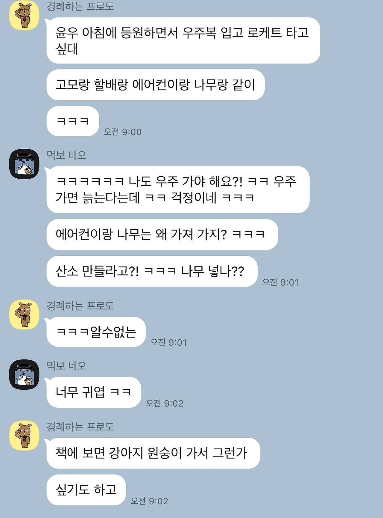 내일이면 33개월이 되는 우리 집 악동은 우주에 푹 빠져있다. 아래 첨부한 카카오톡 가족 단톡방에서 대화와 같이 우주에 가고 싶다는 이야기를 자주 한다. 일론 머스크, 제프 베이조스처럼 로켓 타고 우주에 가겠다는 원대한 꿈을 가진 우리 아들. 혼자 가면 좋으련만 주변 사람들도 끌고 가겠다고 난리이다. 이미 아빠는 자신의 우주여행에 디폴트 구성 멤버이다. 엄마도 기분 좋으면 데리고 가겠다고 한다. 그러더니 다른 가족들도 함께 가자고 한다. 우주가 어떤 곳인지 알기나 하는 건지. 하도 우주에 대해 물어봐서 중력과 공기가 없는 것은 알지만 그게 무엇인지는 모르는 녀석.