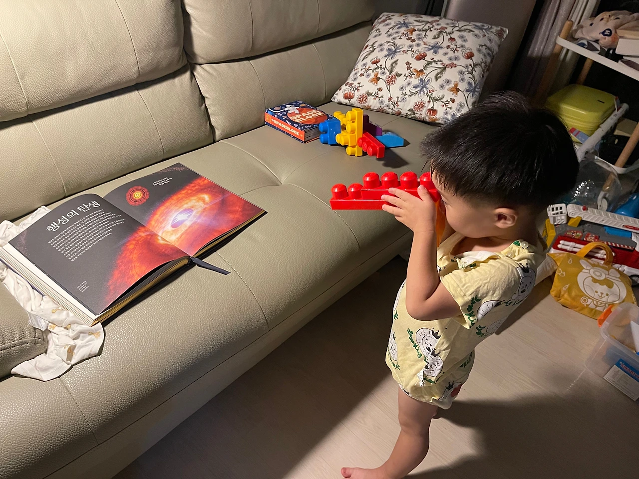 이제 우리 아들은 더 이상 우주 그림책을 보지 않는다. 아빠가 퇴근하면 "아빠가 사준 큰 우주책 읽자" 하면서 손을 잡아 끈다. 잠자기 전에도 우주책을 펼쳐놓고 보다가 잠이 든다. 이 정도면 이미 우주에 살고 있는 게 아닌가 싶다. (지금도 지구라는 우주에 살고 있음)