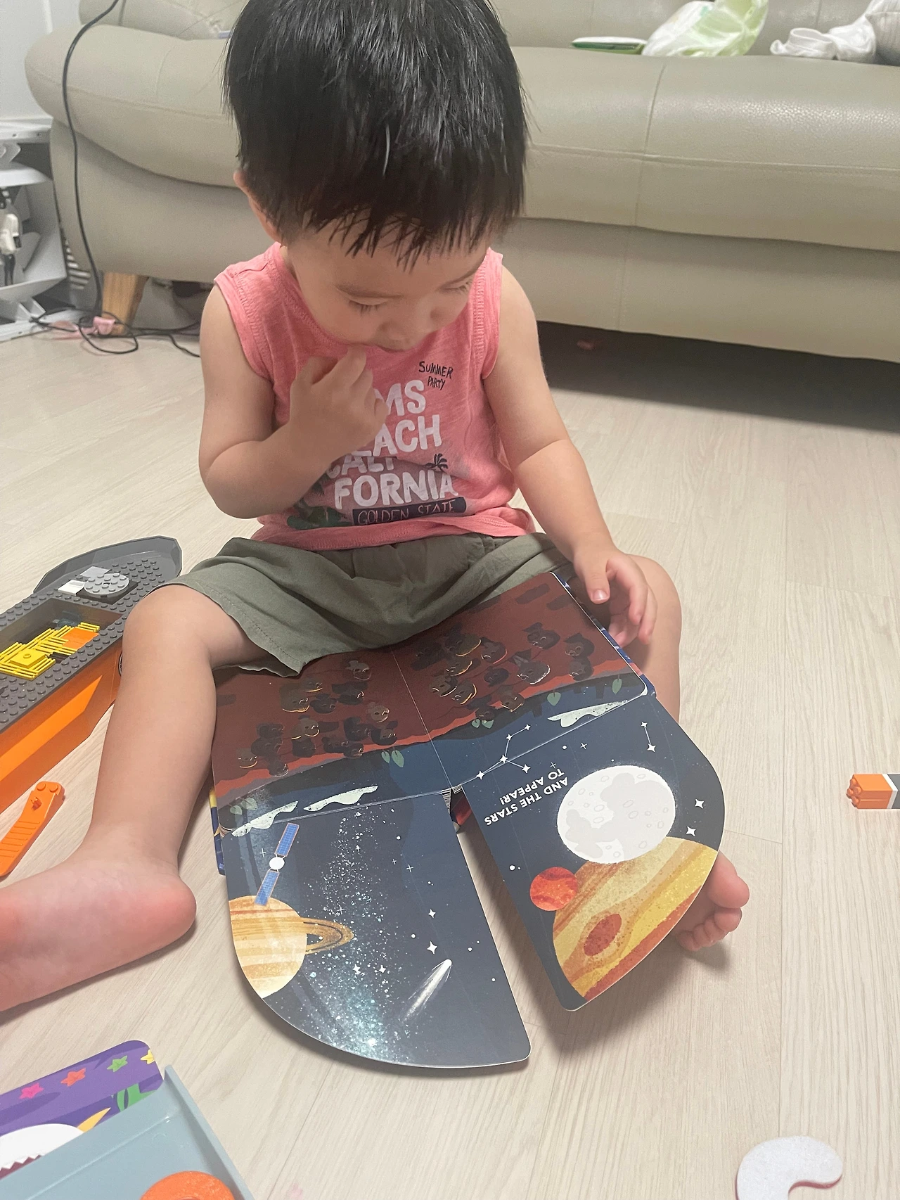 우리 아들이 본격적으로 우주에 꽂힌 시점은 우주 관련 책을 읽고 부터이다. 처음 접한 책은 'Spaceblock'이라고 하는 우주와 로켓에 관한 그림책이다. 이 책을 읽은 아이를 관찰하며 AI와 연관시켜 본 글은 이전에 작성한 바 있다. ( 이전글 링크: 토성이 훌라후프를 돌리는 이유 )