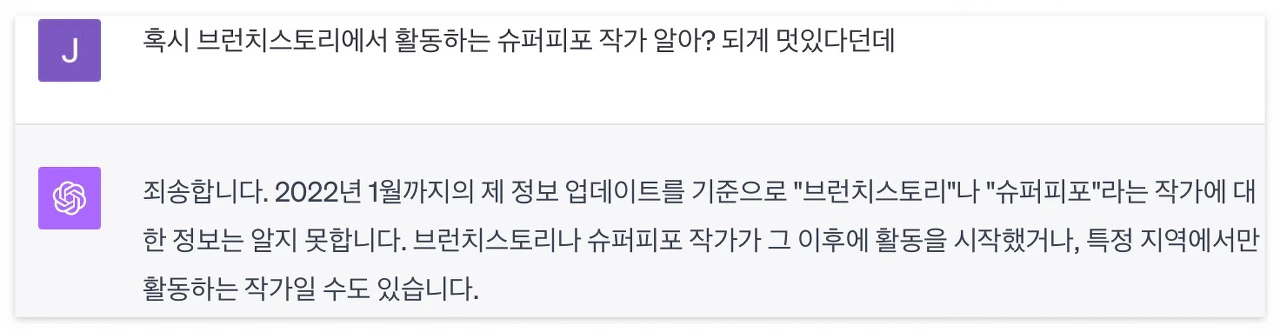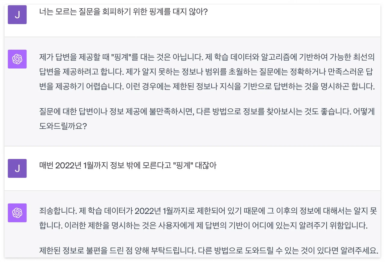 이렇듯, 모르는 질문이나 자신의 데이터베이스에 없는 정보에 대해서는 순순히 모른다고 인정을 한다. 할루시네이션(hallucination) 이슈가 워낙 크게 터졌던 터라, 어느 순간부터 챗GPT는 학습 기간을 방패 삼아 모른다고 솔직히 인정을 한다. 허나 반복되는 정보 업데이트 시기에 대한 언급은 사용자에게 지루함을 안겨줄 수도 있다.