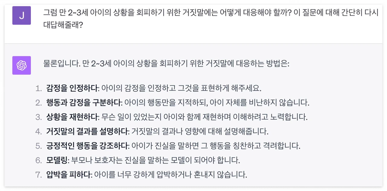 그래. 내가 아무것도 모르고 감정도 없는 인공지능 대상으로 무슨 말을 한 건가 싶다. 우리 아이와 핑계를 대는 모습은 비슷했지만 핑계가 나오는 기저는 명백히 다른데 말이다. 그래도 기왕 이 녀석과 대화를 시작한 김에 한 번 현 상황에 대해 물어보자. 아이가 이제 거짓말을 하고 핑계를 대기 시작하는데 어떻게 하면 좋을지 말이다. 육아를 위한 방법을 챗GPT에게 물어보니 정석적인 답변이 돌아온다.
