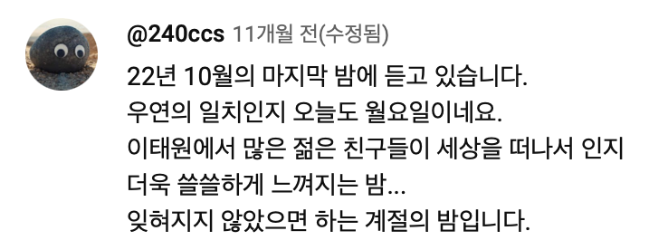하지만 이제 우리에게 10월의 마지막 날은 이용의 잊혀진 계절도 아닌 할로윈 파티도 아닌 이태원 참사로 기억된다. 정확히 10월의 마지막 날은 아니었지만 작년 오늘인 2022년 10월 29일 이태원의 좁은 골목에서는 159명의 귀한 생명이 속절없이 사라져 갔다.