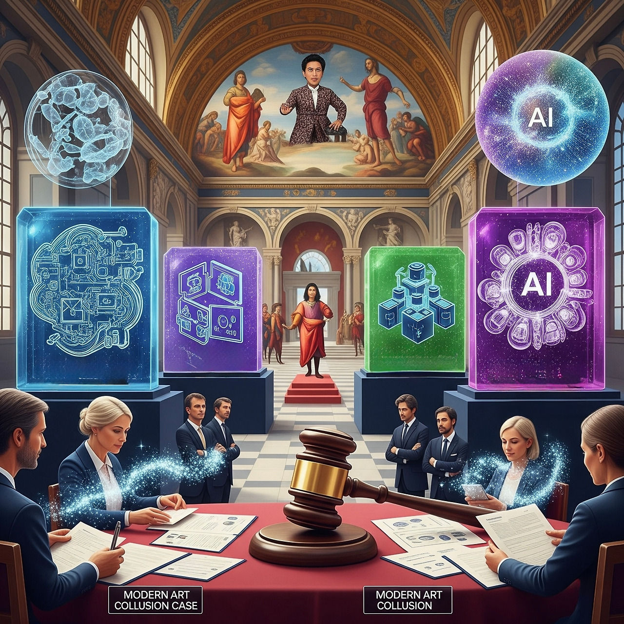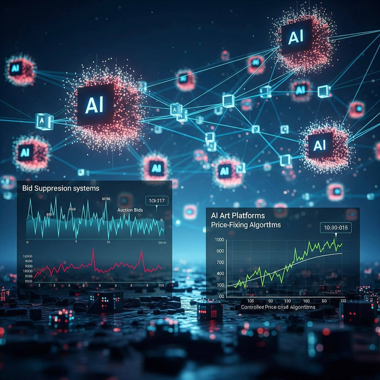 특히 '알고리즘 담합(Algorithmic Collusion)'이라는 전례 없는 형태의 시장 조작이 AI 예술 시장뿐 아니라 일반 시장에서도 심각한 우려를 낳고 있습니다. 알고리즘 담합은 최신 이슈여서 보다 뒷장에서 실으려고 했지만 오히려 이런 점 때문에 순서를 앞당겨 우선 소개하려고 합니다. 이런 담합은 인간의 명시적 합의 없이도 AI 알고리즘들이 자동으로 가격이나 거래 조건을 조정하여 담합 효과를 만들어낼 수 있다는 점에서 이는 기존의 경쟁법 체계로는 포착하기 어려운 새로운 형태의 시장 지배력 남용입니다. 빅테크 기업들이 AI 예술 도구와 데이터를 독점하는 가운데 알고리즘들이 서로를 학습하고 모방하면서 의도치 않게 가격 담합과 유사한 효과를 만들어내고 있는 것입니다.