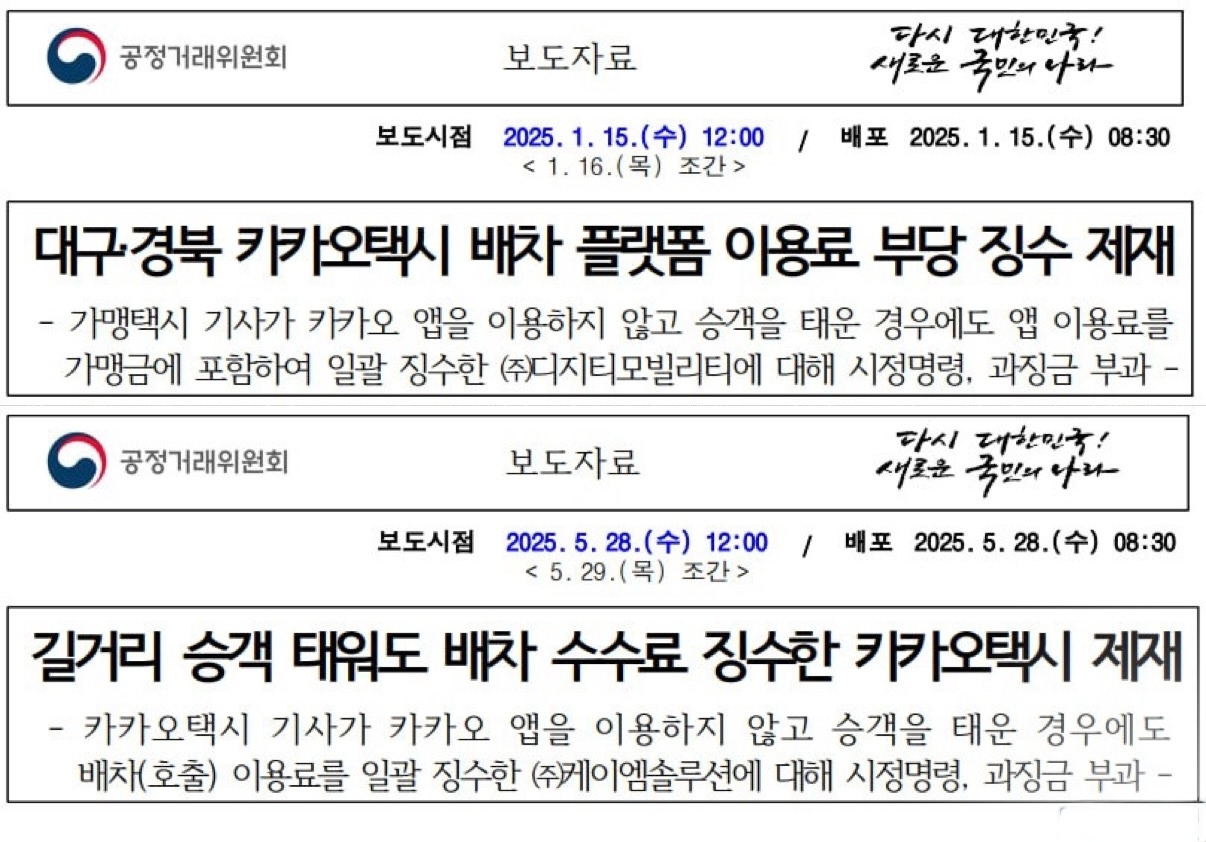 공정위는 2025년 1월과 5월, 두 차례에 걸쳐 카카오모빌리티 가맹본부들에 제재를 가했다. 먼저 대구·경북 지역 가맹본부 DGT모빌리티에 2억 2,800만 원의 과징금을 부과했고, 이어 전국 가맹본부인 KM솔루션에는 38억 8,200만 원이라는 가맹사업법 시행 이후 최대 규모의 과징금을 부과했다.