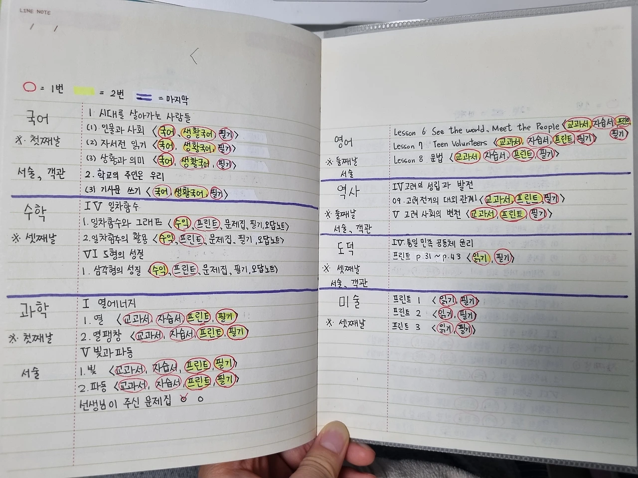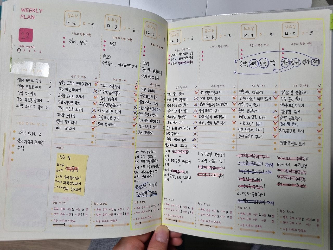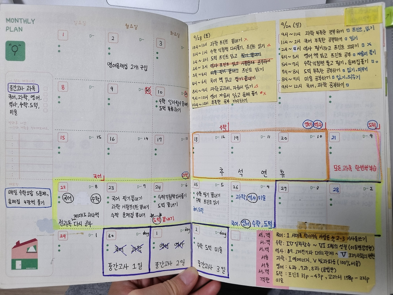 플래너를 쓰니 내가 해야 하는 공부의 전체 범위를 한눈에 파악할 수 있었다. 그리고 각 과목별로 해야 하는 세부내용을 체크해서, 내가 확실히 끝냈는지 아닌지도 알 수 있었다. 각 과목별로 (1) 교과서 정독 (2) 학습지 정독을 최소 2번씩 했다. 플래너가 예뻐서 내가 아끼던 보라색 펜으로 중요한 내용을 체크했던 기억이 있다.