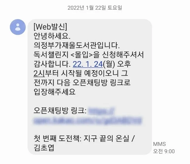 지금까지 매년 나의 신년계획에는 독서가 있었다. 2022년 1월 어김없이 독서를 목표로 두고, 약간의 강제성을 더하기 위해 의정부 가재울도서관에서 주최하는 비대면 독서 챌린지 '몰입'에 참여했다. '몰입'은매주 정해진 분량을 읽고 미션을 해결하면서 책을 완독하는 프로젝트다.