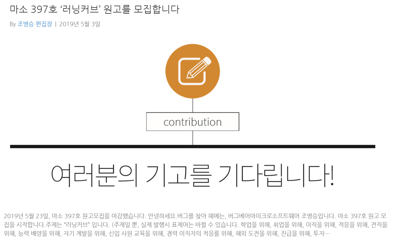 브런치에 글을 한 달에 한번 정도의 주기로 발행하다 보니 이제 어디 기고해도 되지 않을까?! 라는 말도 안 되는 자신감이 차오르던 즈음, 페이스북에서 한 글을 보고야 말았다. 바로 여러분의 기고를 기다린다는 마소의 기고 모집 글...!