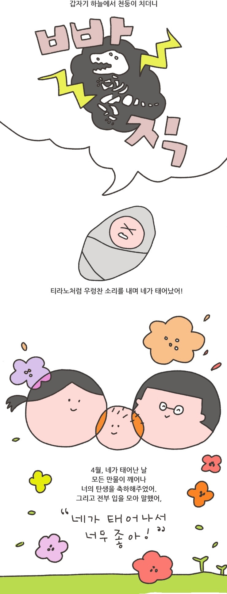 “티라노의 공격을 받았지만 소중한 너를 지키기 위해 엄마는 노력했어, 그리고 네가 태어났지. 넌 봄에 태어났어. 그날은 만물이 깨어나고 피어난 날이었어. 온 세상이 너의 탄생을 축하하고, 네가 태어나서 너-무 기쁘다고 말해주었어.”