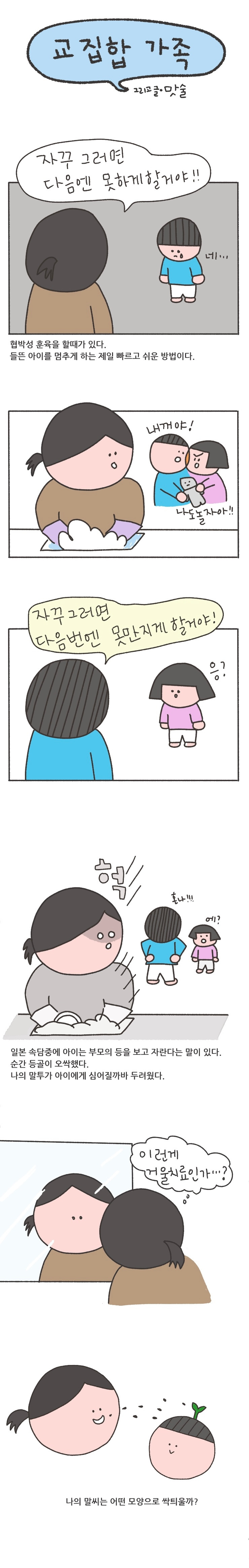 콩을 심어놓고 팥이 자라길 바라는 건 어리석은 일중에 가장 으뜸일듯하다. 나의 ‘말씨앗’은 아이에게 심어져 어떤 모습의 싹으로 자랄지… 아마 어렴풋이 나도 알 것이다. 아이의 말이나 행동에 흠칫 놀란 경험은 누구에게나 있으니까..