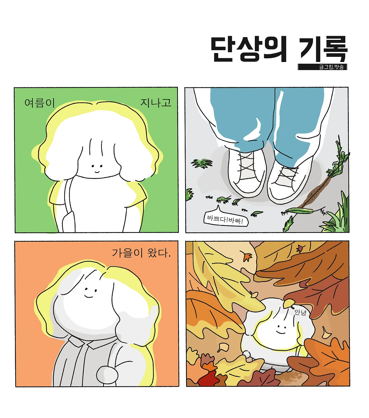 여름날엔 자주 발아래를 보며 걸었다. 줄지어 바쁘게 움직이는 개미들, 하루가 다르게 자라는 이름 모를 풀들. 칙칙한 흙 위는 어느새 푸르고 푸른 땅이 되었다. 혹여나 방해될까 나는 굽은 등을 더 굽혀 조심조심 걸었다. 분주하던 여름날이 지나고, 땅 위는 다시 조용해졌다. 오랜만에 고개를 들었다. 하나 둘 색을 바꾼 이파리들.