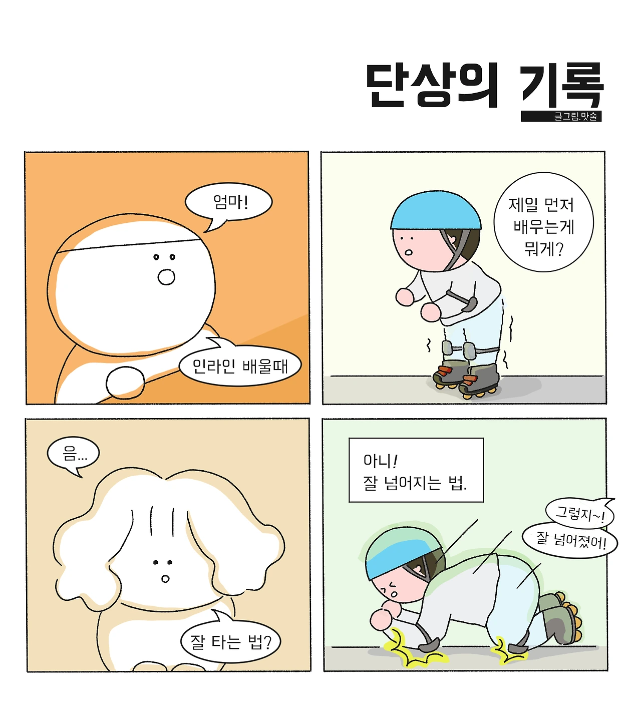 아이들은 넘어지는 순간을 저항하지 않기 때문에 순수하게 자알 넘어진다. 넘어지고 나서도 손을 툭툭 털고 일어나거나 너무 아프면 뿌엥-하고 한참 울다가 다시 하던 놀이를 이어간다. 커가면서 넘어지는 것에 대해 조금씩 부끄러움이 생기기 시작했던 것 같다. 자주 넘어지진 않지만, 넘어질 때면 안간힘을 쓰며 넘어지지 않으려 애쓰다 오히려 크게 다치는 모습도 종종 보았다. 나도 예전에 발목을 삐끗해서 넘어질 뻔한 적이 있었다. 김흥국 아저씨의 호랑나비춤을 추며 그 위기는 벗어났지만… 넘어져 아픈 것보다 부끄러움 때문에 며칠을 이불킥 했던 경험이 있다. 그때 나에겐 잘 넘어질 용기가 필요했다.