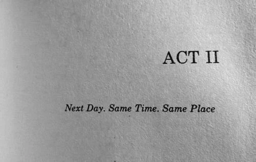 한적한 시골길, 나무 한 그루, 남자 두 명. 희곡 <고도를 기다리며>가 시작되는 모습들이다. 주인공 블라디미르와 에스트라공은 그 인적 없는 길에서 만난다. 그들은 마주치자마자 잘 알고 지내는 사이인 것처럼 건조한 인사를 나눈다. 그리고 익숙하다는듯 대화를 시작한다. 하지만 몇 마디 주고받는 것도 잠시, 에스트라공은 구두가 안 벗겨진다고 투덜거리고, 블라디미르는 뜬금없이 마지막 순간이란 단어에 꽂혀 환상에 빠진다. 그러더니 갑자기 구원받은 도둑놈에 대해 이야기하고, 먼 배경을 바라보던 에스트라공이 멋진 경치라며 감탄하고는 이제 가자고 말한다. 앞뒤가 맞지 않고 뭘 얘기하고 있는지 감도 안 잡히는 이 상황에서, 블라디미르는 둘의 목적을 상기한다. 고도를 기다려야 된다는 것이다. 그래서 가면 안 된다고 말한다. 에스트라공은 깜빡했다는듯 참 그렇지, 라고 맞장구 치고 고도를 기다린다.