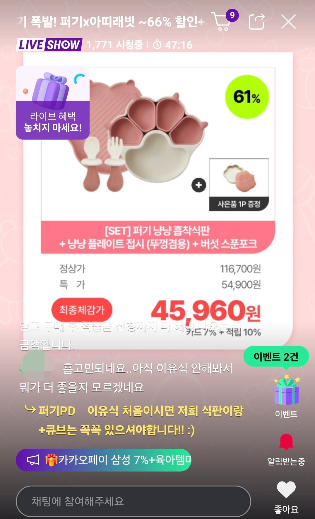 다음 주면 축복이도 이유식을 시작한다. 미리 웬만한 건 준비를 다 했다고 생각하는데 식판을 안 산 거 같아서 오전 11시에 알람까지 맞추고 퍼기 라이브 방송에 참여했다.