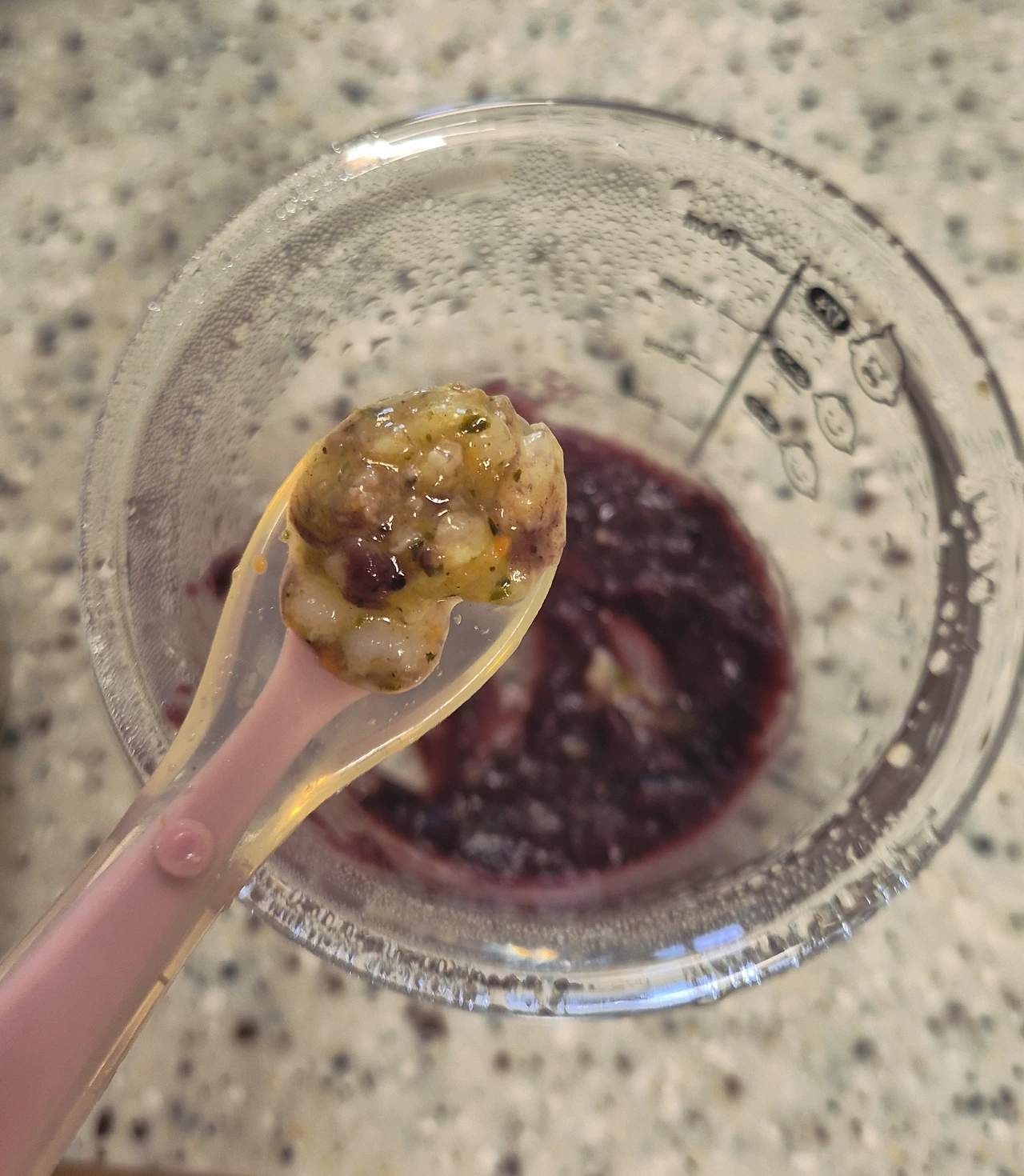 하지만 이 방법도 다섯 스푼 정도까지는 잘 먹혔으나 그 이후부터는 약빨이 떨어졌다. 그래서 그냥 블루베리바나나 퓌레와 소고기죽을 섞어서 줘봤다. 축복이는 살짝 달라진 맛을 보느라 그렇게 몇 숟가락을 받아먹었고, 40~50mL의 이유식을 해치웠다. '완밥' 성공!