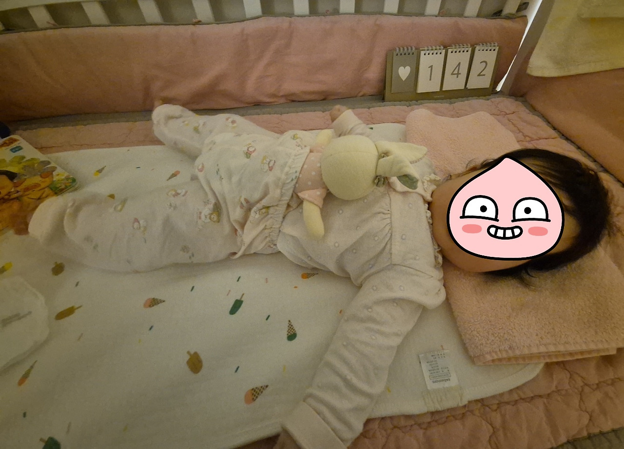 수면교육은 원래 등 대고 혼자 자는 걸 목표로 하지만, 나는 거기까지 갈 수가 없었다. 나의 일차 목표는 젖물잠 퇴치이므로 일단 젖 물고 자는 것만 끊고자 꼭 안아서 달랜 거다. 꼭 수면준비 3시간 만에 잠에 들었다.
