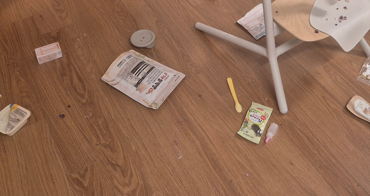식탁 아래 바닥을 보니 참담했다. 주의를 끌기 위해 사용했던 도구들이 아무렇게나 널부러러져 있었다. 축복이의 옷은 이미 밥 범벅이었다. 축복이가 안 먹겠다고 고개를 이리저리 돌리는 바람에 떨어진 거였다.