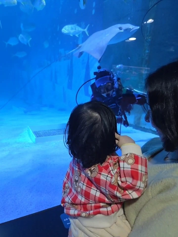 확실히 7개월 때보다는 물고기를 인식했고, 물고기가 가는 대로 시선을 따라가며 더 잘 보는 모습이 보였다. 그리고 수조 안에 있는 잠수부 언니가 팔하트를 그리자 나름대로 자기식으로 손가락을 볼에 찍으며 '예쁜 짓'을 하기는 했다. 하지만 내가 상상한 것만큼의 큰 관심을 보이지는 않았다. 채채는 아쿠아리움을 즐기기엔 아직 어린 가보다. 한 세네 살만 되어도 아쿠아리움에서 돌아다니고 이거 보자, 저거 보자 하겠지?