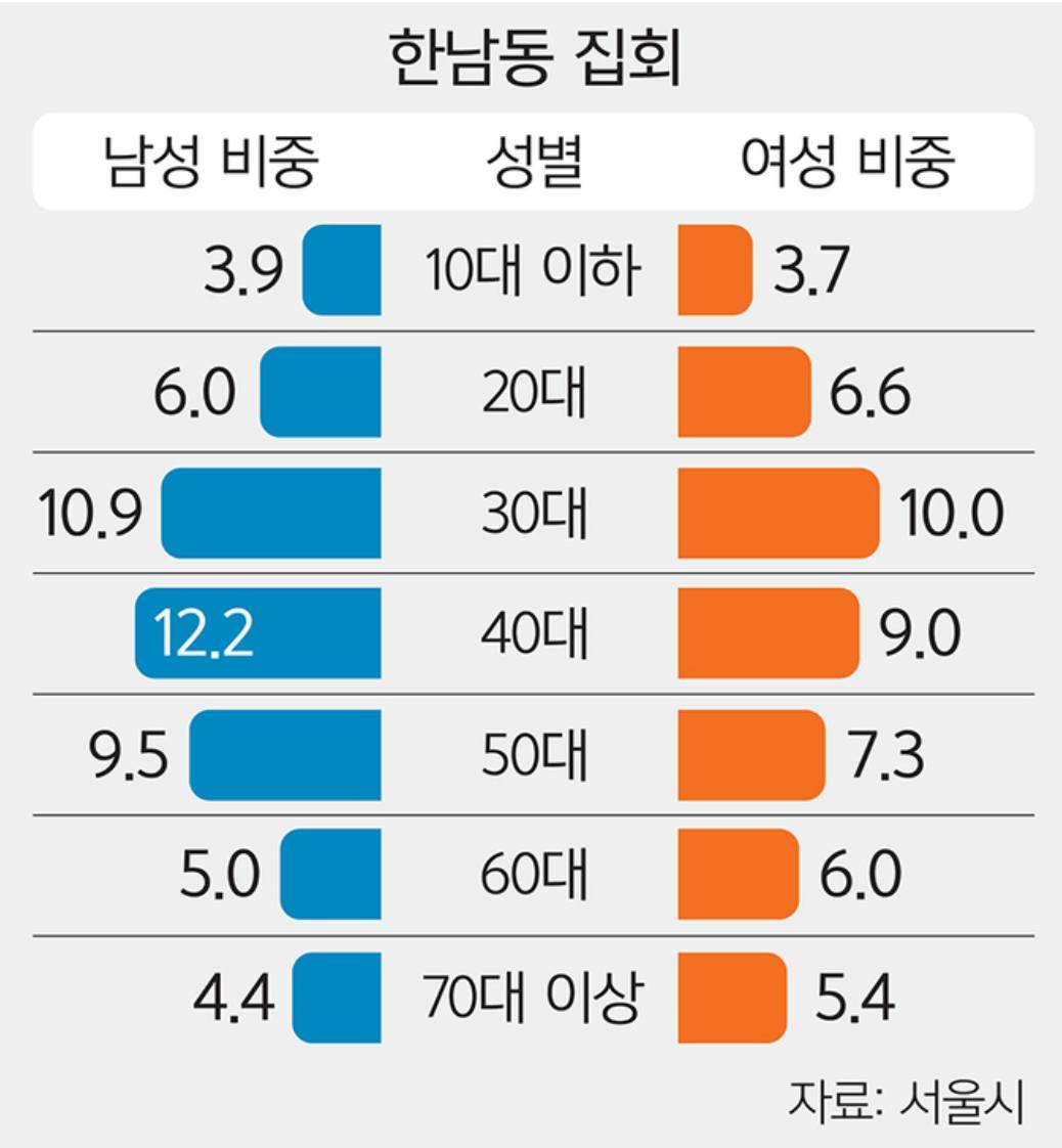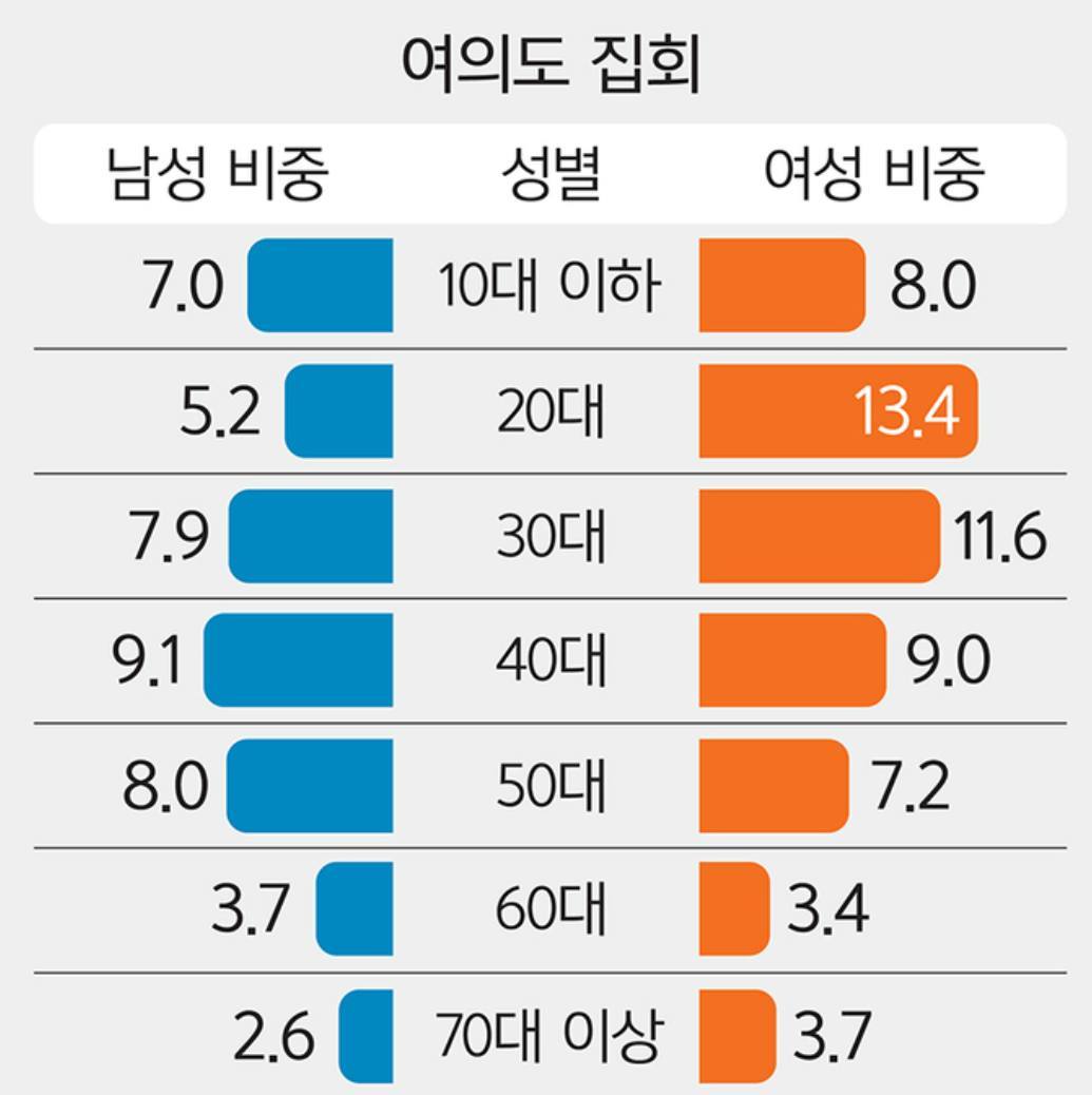 흥미로운 건 탄핵 반대, 소위 윤 지지 집회에서 나타나는 젊은 남녀의 성비이다. 2030 여성에게 나타나는 압도적인 '반윤' 성향에도 불구하고, 소위 '한남동 집회'에 참여하는 남녀의 성비는 큰 차이가 없다. 이만 놓고 보자면, "이대남이 거리에서 소리치며 친윤 분위기를 주도하고 있다."라는 분석은 다소 어패가 있는 것이다.