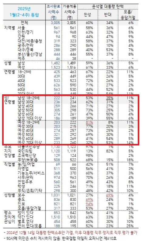 젊은 여성층에서 윤 지지가 거의 없음에도, 윤 지지 집회에 참여하는 젊은 남녀 성비는 거의 1:1로 균등하게 나타나는 이유가 무엇일까?