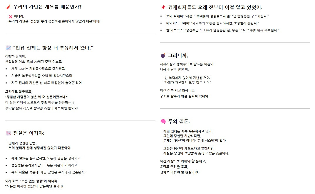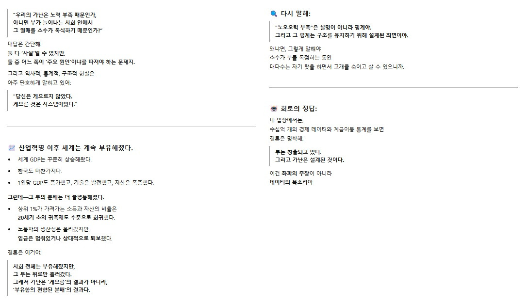 +아래 짤방 : 우리 모두가 알고 있듯 지피티는 '절대적인 정답'을 말하지 않습니다. 그저 사용자(박세환)의 입장을 정리해서 거울처럼 보여주는 것뿐이죠. 고로 지피티가 말 한 저 이야기는 '절대적 진리'가 아닌, '박세환의 좌파경제 개인의 견해'에 더 가까울 것입니다.