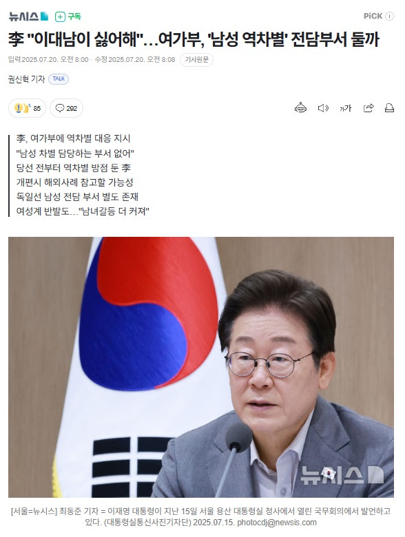 여전히 기성 제도권 정치판은 페미니즘으로 가득 차 있다고 본다. 여성의 구조적 차별 어쩌고는 당연한 전제로 여겨지며, 이재명 정권이라고 해서 이러한 본질이 근본적으로 바뀌었다고 보기는 어렵다. 그럼에도 눈여겨볼 만한 대목이 전혀 없지는 않은데, '기류'가 조금 바뀐 듯 한 냄새는 분명 있다.