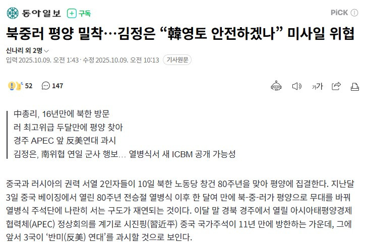 얼마간은 북중러 레드팀 동맹 간에 균열이 발생할지도 모른다는 기대가 있었더랬다. 물론 이제 현명한 이들이라면 더 이상 그런 기대를 붙들고 있지 않을 것이다. "그들 간에도 균열이 있을 것." "적어도 러시아라면, 더 이상 북중과 오래 함께하고 싶어 하지 않을 것."이라는 세간의 기대가 무색하게, 시간이 흐르면 흐를수록 북중러 간의 연대는 더더욱 튼튼해지는 중이며, 이제 그들은 틈만 나면 만나모여 "사악한 서방 자유세계의 야욕을 분쇄"하기 위한 진지한 논의를 나누고 있다.