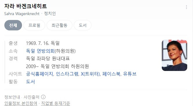 추가로 좌파연합의 분열은 이미 독일의 좌파정치인 자라 바겐크네이트로 인해 가시화되었다. 바겐크네이트는 좌파가 반미주의랑 페미피씨를 같이 들고 갈 수는 없다는 명분으로 '본진'이었던 좌파당에서 내분을 일으켰고 결국 탈당 후 바겐크네히트당을 창당, 반미 러시아는 들고 가지만 페미피씨는 버리는 식으로 논리적 딜레마를 극복할 것을 천명했다. 그리고 이후 치러진 총선에서 '본진'이었던 독일 좌파당을 더블도 아닌 트리플 스코어로 처바르면서 그 기염을 토했다.