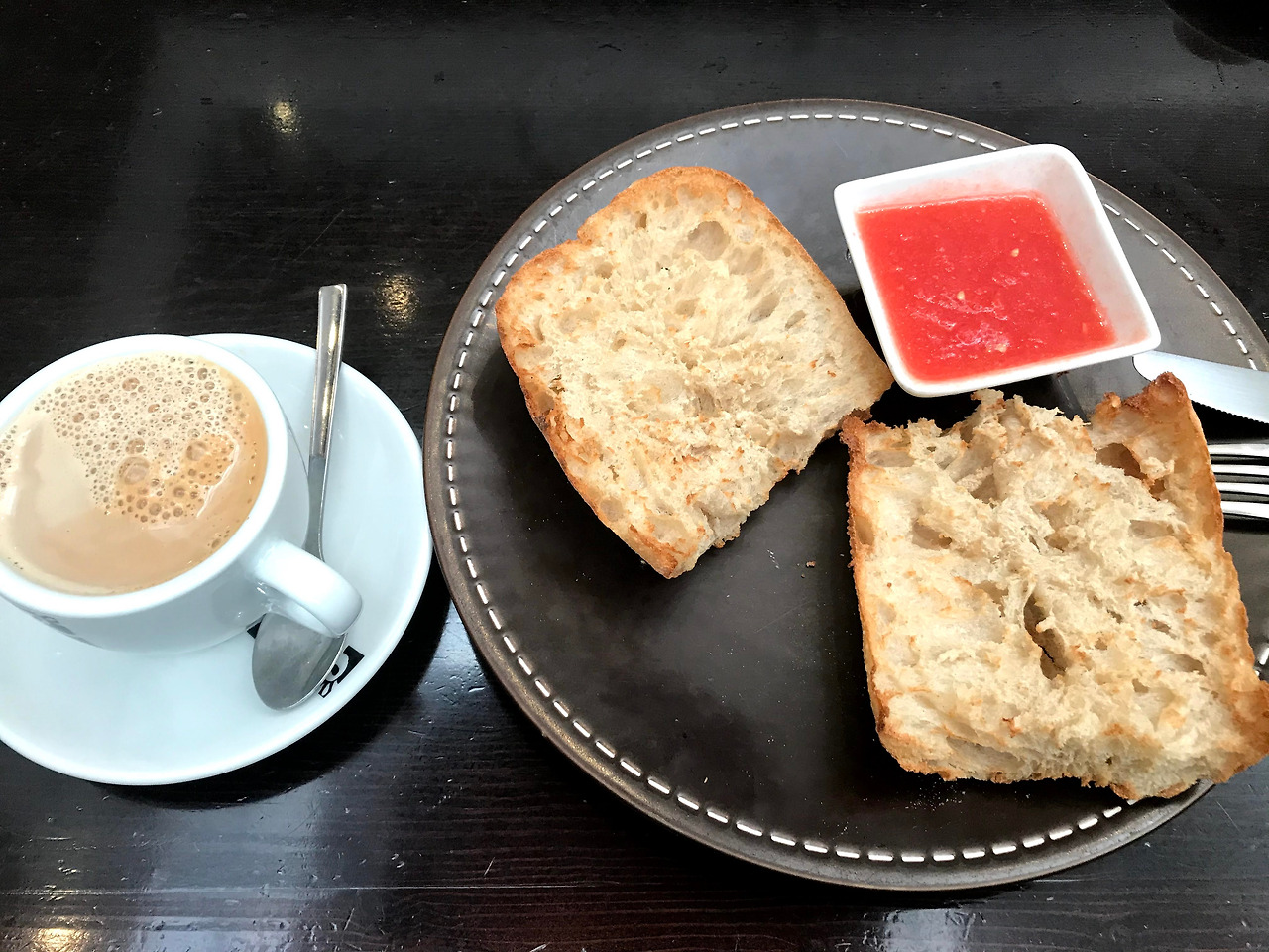 이 중 한 가지씩을 골라 주문하면 평범한 desayuno 세트가 되는데 가격은 어느 정도일까? 한국 기준으로 생각하면, 적어도 5천 원 정도 들지 않을까 싶은 desayuno는 놀랍게도 1.5-2.5유로로 즐길 수 있다는...!