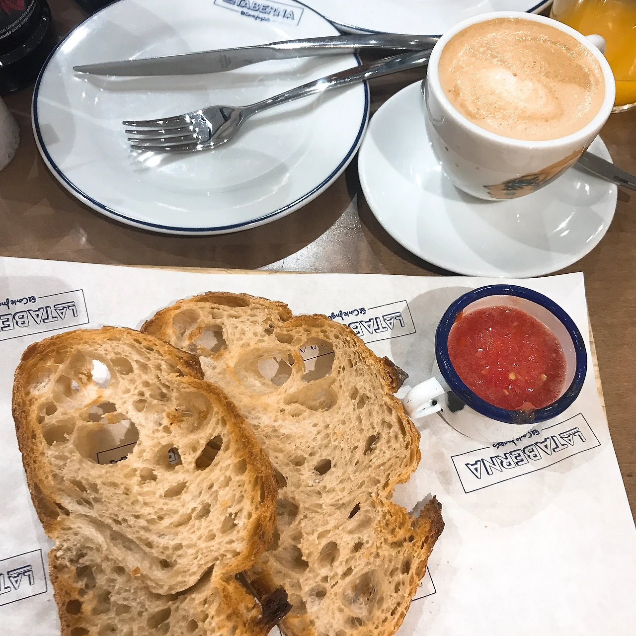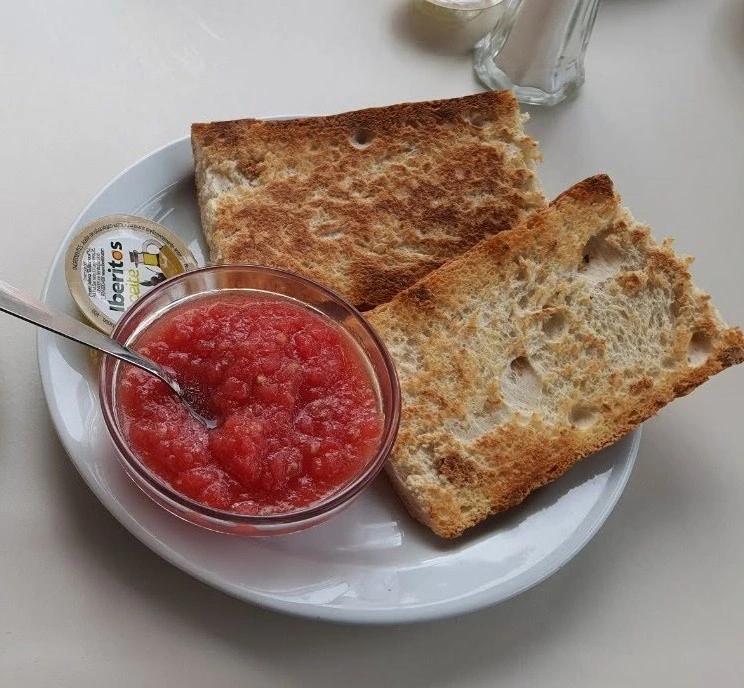 - tostada (또스따다) : 토스트. 식빵보단 스페인식 바게뜨인 barra(바라)가 구워져서 나온다. mermelada잼)이나 mantequilla(만떼끼야, 버터), 혹은 tortilla(또르띠야, 스페인식 계란 오믈렛으로 감자나 양파, 하몽을 다져 넣고 두껍게 찌듯이 구워내는 요리) 나 jamon(하몽)을 곁들여 먹는다.