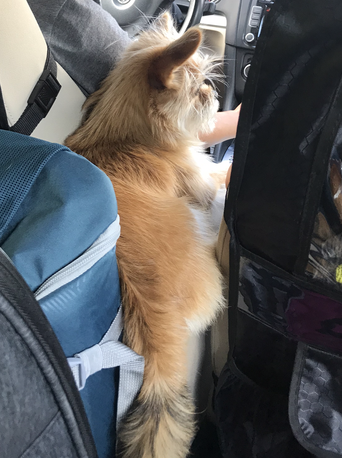 차로 하는 여행을 잘 견뎌줄까 걱정했던 코코는 생각보다 아주 편안하게 여행을 즐기고 있다. 자리를 만들어주기 위해 아이들 카시트 사이에 도그 캐리어를 설치해주었지만 그건 거들떠보지도 않고 당당히 운전석과 조수석 자리에 앉아 드라이빙을 즐긴다. 코코가 조금 더 큰 사이즈였다면 눕지도 앉지도 못했을 거지만, 우리 강아지 사이즈엔 한 뼘만 한 공간도 충분하다.