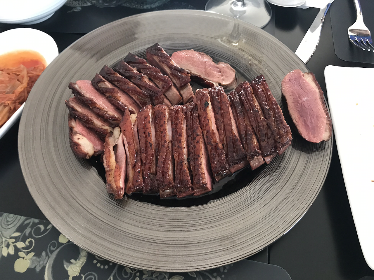 푸아그라를 생산해준 오리는 메인 요리의 스테이크도 되어 주었다. 간만에 먹는 오이와 호박 밑반찬이 입에 감긴다.