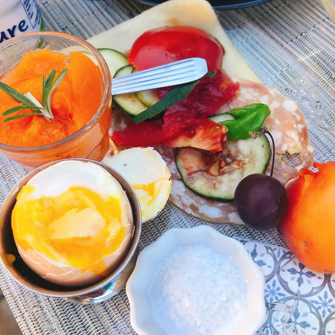 다음 날 아침, 약속한 시간에 아침식사가 배달되었다. 테라스 식탁에 식탁보가 깔리고 바구니에 한가득 담겨 올라온 음식들이 푸짐히 차려졌다.