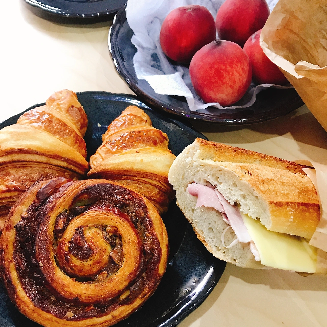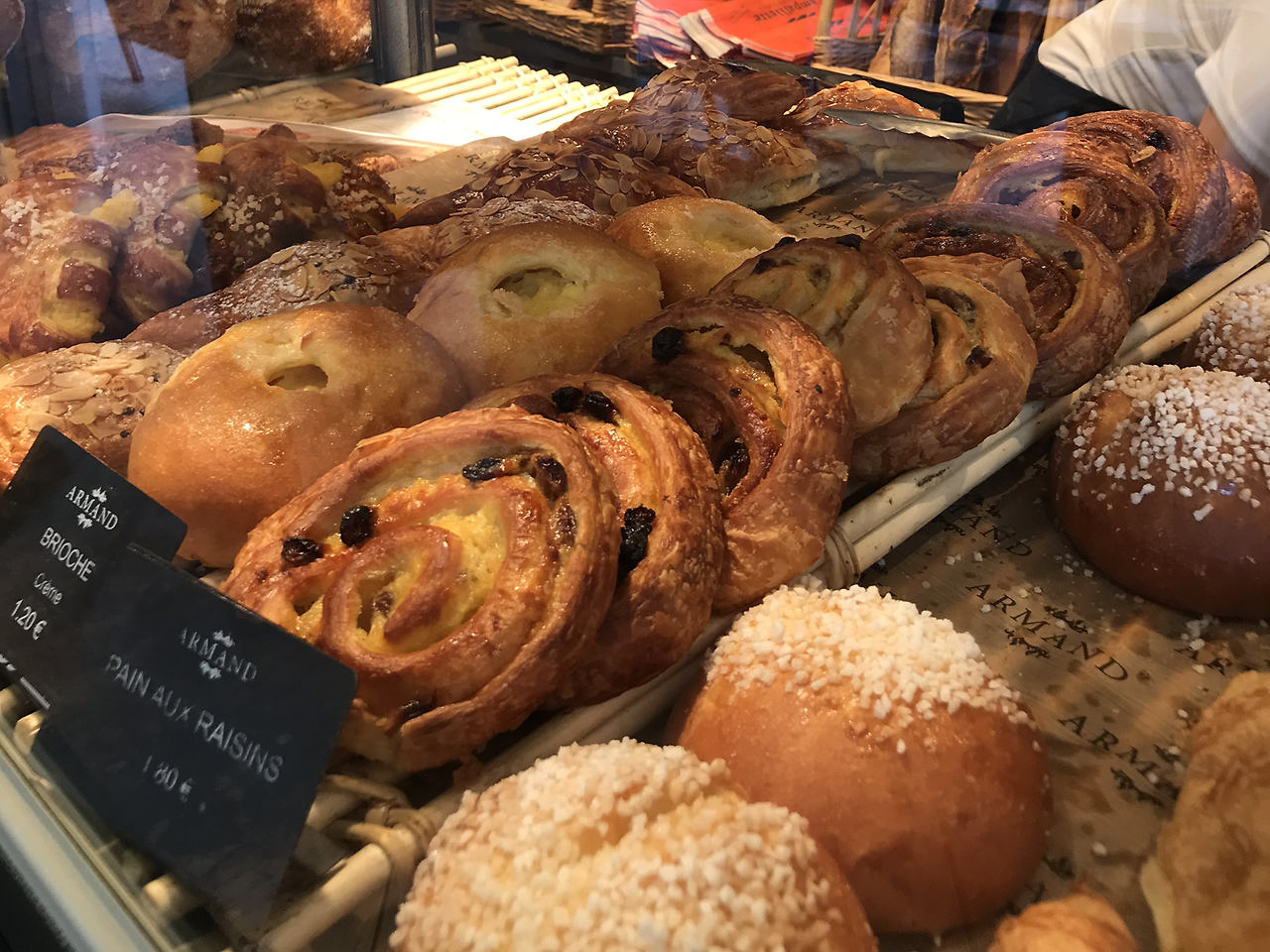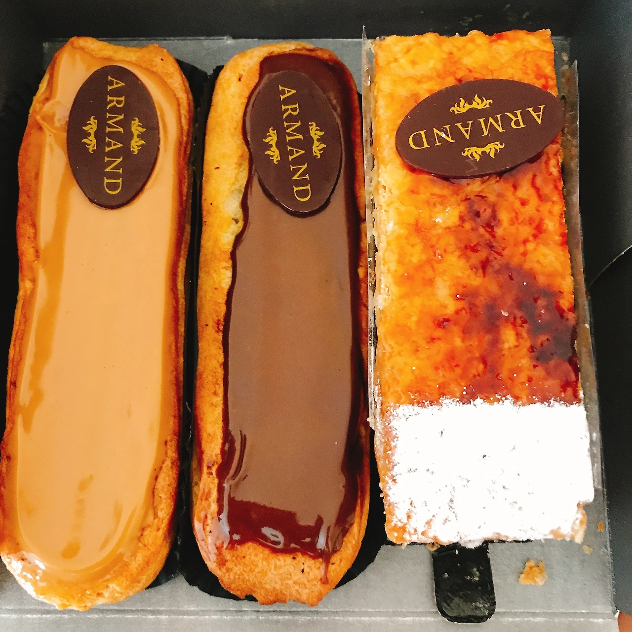 또, 버터향 듬뿍 파삭한 크루아상(croissant)도 빠질 수 없다. 거기에 파이 결 사이사이 초코가 느껴지는 쇼콜라틴(chocolatine- 프랑스 남부에선 뺑 오 쇼콜라 pain au chocolate라고 하면 싫어한다고)까지 모두 후각부터 미각까지 만족시키는 기본빵들. 그리고 모든 디저트가 훌륭하지만 그중에서도 에끌레어(eclair)는 보이면 한 조각이라도 사야 했던 나의 최애 디저트이다. 한 입 물었을 때 부드러운 빵 안에서 배어 나오는 부담스럽지 않은 슈크림 필링이 엄지를 들 수밖에 없게 만든다.