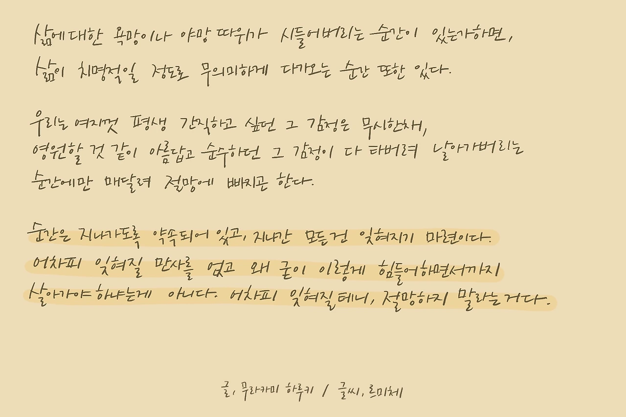 20대 후반만 해도 다양한 경험들에 가슴 뛰며 이렇게 살면 되겠구나라는 생각으로 하루를 살았는데 나이가 들수록 생각이라는 게 점점 사라져 가고 감정이라는 것에 무뎌지는 것 같다. 나는 어릴 때 바라던 모습대로 겉모습은 어른이 됐는데 왜 이렇게 마음이 시큰할까. 나는, 아니 우리 모두는 어른이 되면 왜 이렇게 바뀌어야만 할까.